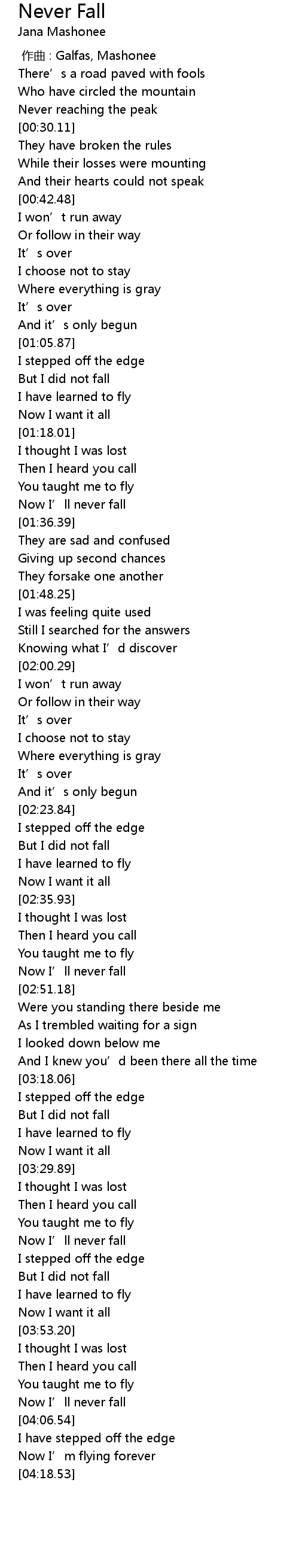 | [03:38.86] | Now I' ll never fall |