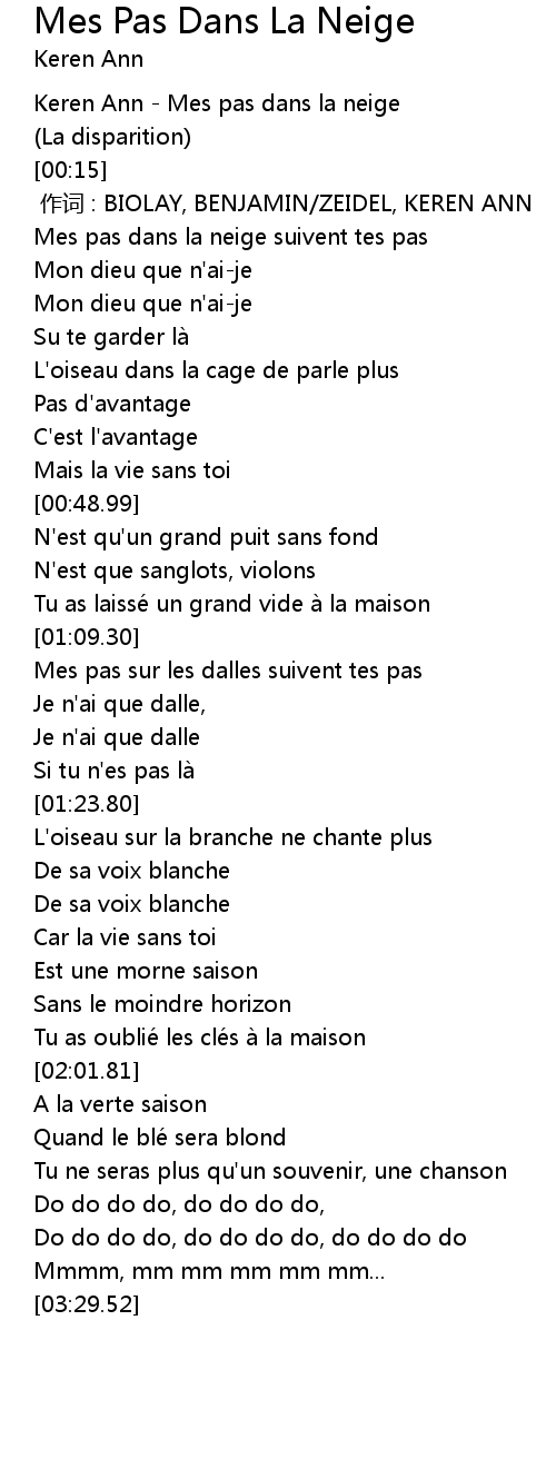 | [00:17.49] | Mes pas dans la neige suivent tes pas |