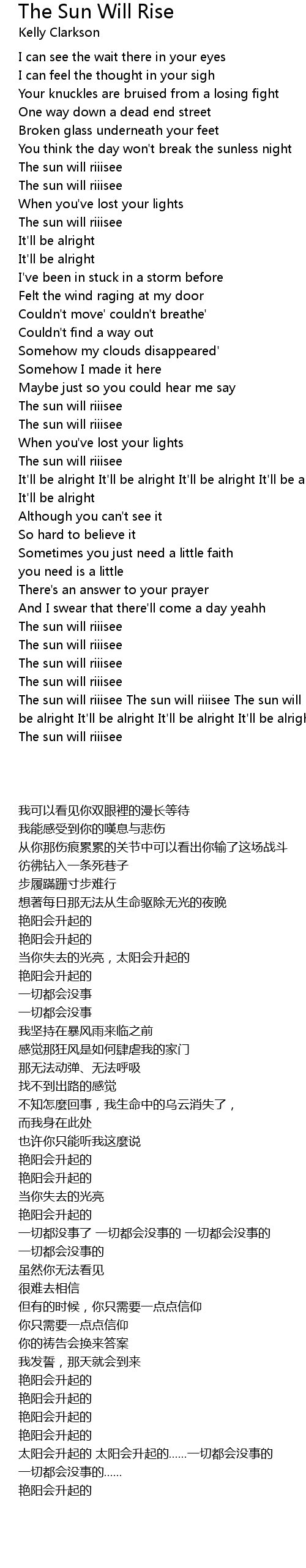 The sun will riiisee The sun will riiisee The sun will riiisee It'll be alright It'll be alright It'll be alright It'll be alright It'll be alright |