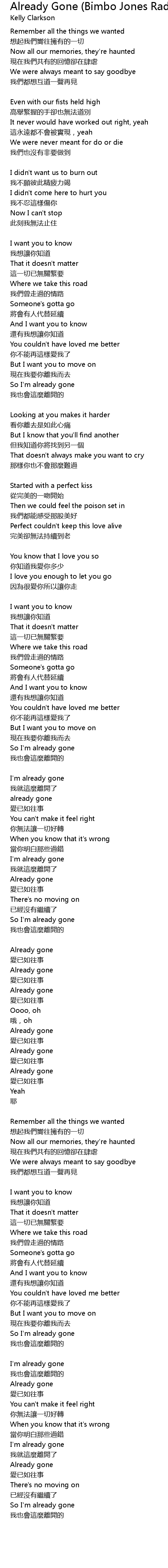 | Song | Already Gone (Bimbo Jones Radio Edit) |