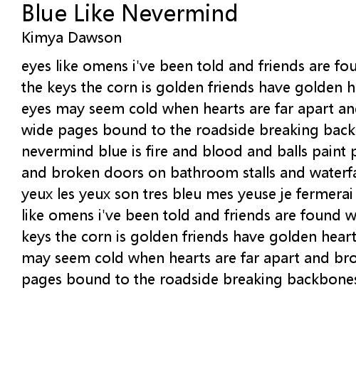 | eyes like omens i' ve been told and friends are found when keys are stolen find the keys the corn is golden friends have golden hearts and souls and icy blue eyes may seem cold when hearts are far apart and broken when the sky is open wide pages bound to the roadside breaking backbones as i drive blue like nevermind blue is fire and blood and balls paint peeling on the bedroom walls and broken doors on bathroom stalls and waterfalls and booty calls je vois les yeux les yeux son tres bleu mes yeuse je fermerai et dites je suis fatigue eyes like omens i' ve been told and friends are found when keys are stolen find the keys the corn is golden friends have golden hearts and souls and icy blue eyes may seem cold when hearts are far apart and broken when the sky is open wide pages bound to the roadside breaking backbones as i drive blue like nevermind |