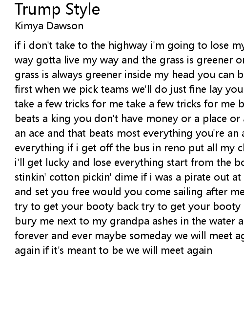 if i don't take to the highway i'm going to lose my head can't do things your way gotta live my way and the grass is greener on the wrong side of the bed the grass is always greener inside my head you can be my partner i'll chose you first when we pick teams we'll do just fine lay your meld across from mine and take a few tricks for me take a few tricks for me be sure to remember a ten beats a king you don't have money or a place or a pretty pretty face but you're an ace and that beats most everything you're an ace and that beats most everything if i get off the bus in reno put all my chips on number nine maybe i'll get lucky and lose everything start from the bottom one more time without a stinkin' cotton pickin' dime if i was a pirate out at sea stole all your gold and set you free would you come sailing after me? to try to get your booty back try to get your booty back try to get your booty back your booty back from me bury me next to my grandpa ashes in the water and the wind that way i can drift forever and ever maybe someday we will meet again maybe you and me will meet again if it's meant to be we will meet again |