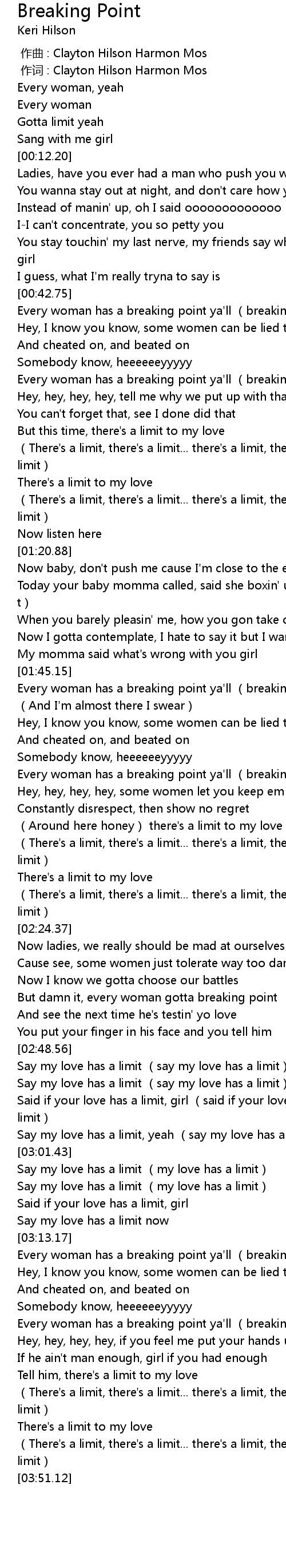 | [03:26.42] | Every woman has a breaking point ya' ll breaking point |