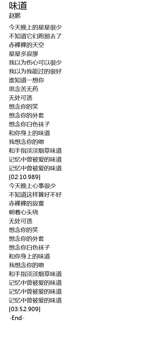 | [01:46.890] | 和手指淡淡烟草味道 |