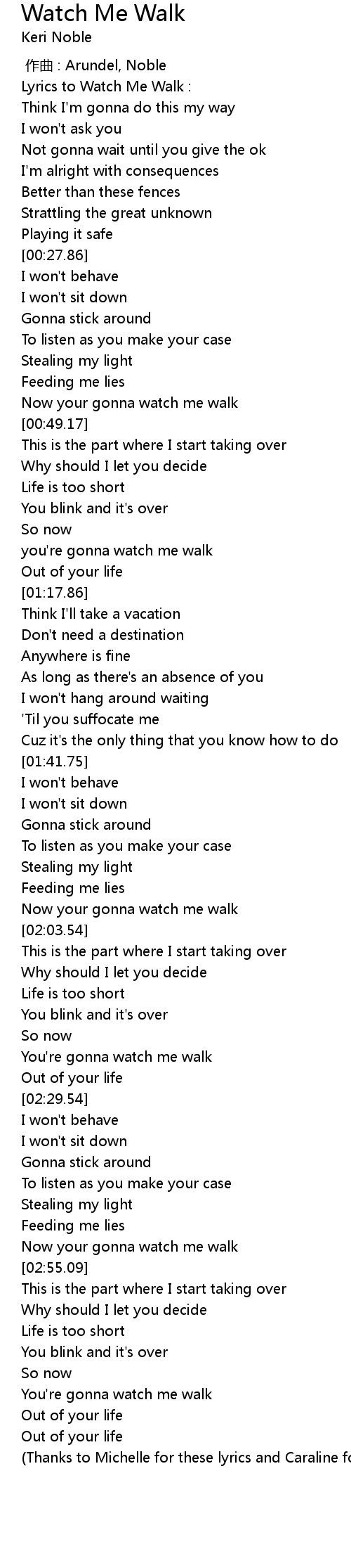 | [00:00.00] | Lyrics to Watch Me Walk : |