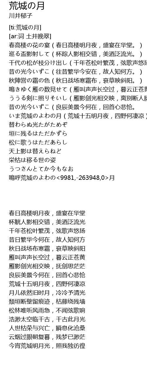 | [04:14.01] | 鳴呼荒城のよわの<9981,-263948,0>月 |