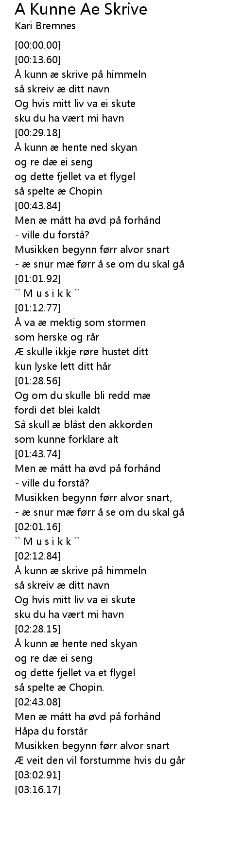 | [02:13.03] | Å kunn æ skrive på himmeln |