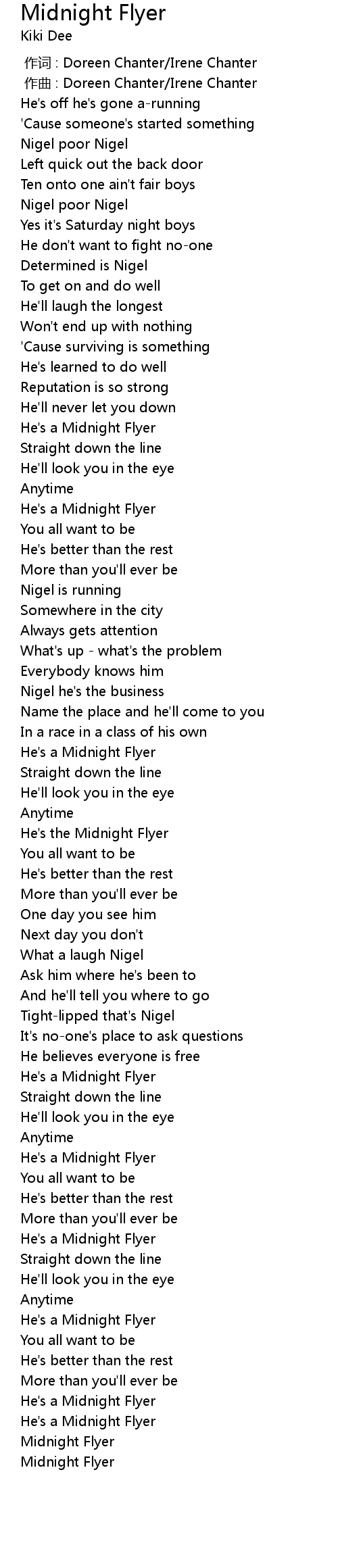 | [01:43.408] | He's the Midnight Flyer |