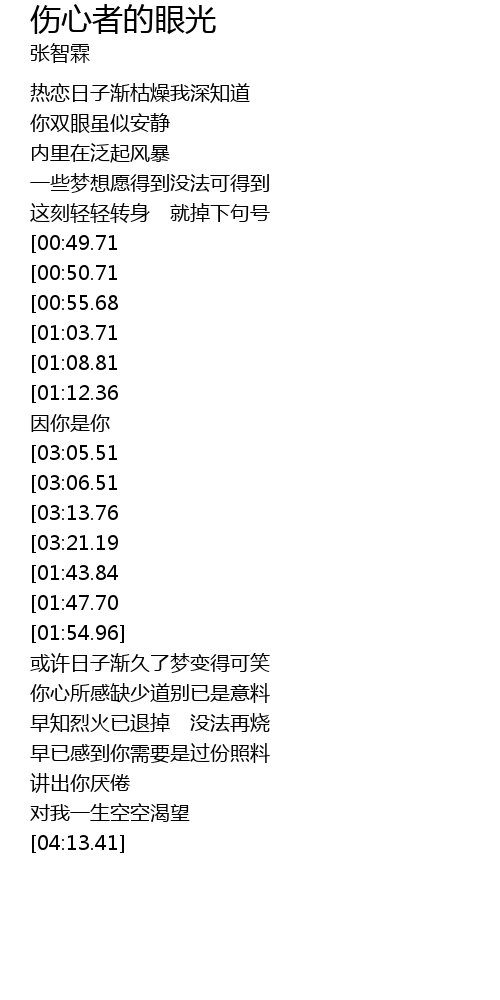 | [03:57.84][03:21.19][01:36.56] | 伤心者的眼光 怎么不敢看 |