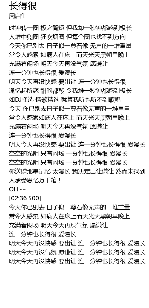 | [01:51.440] | 明天今天再没快感 要出让 连一分钟也长得很 爱漫长 |