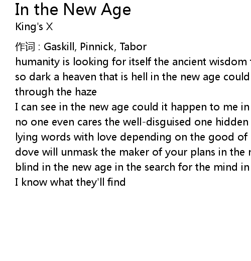 | I can see in the new age could it happen to me in the new age the trap is open no one even cares the welldisguised one hidden in their stares disguise your lying words with love depending on the good of man the truth the symbol of a dove will unmask the maker of your plans in the new age i see the blind lead the blind in the new age in the search for the mind in the new age but | |