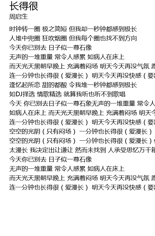 | [03:11.980] | 连一分钟也长得很(爱漫长) 明天今天再没快感(要出让) 连一分钟也长得很(爱漫长) |