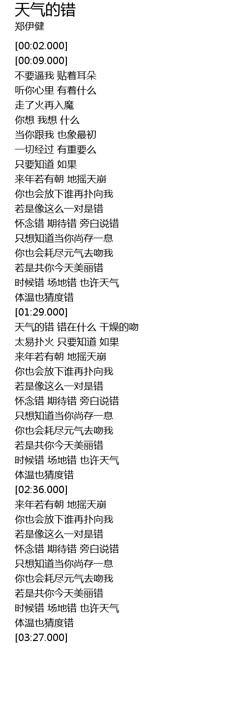 | [01:43.000] | 天气的错 错在什么 干燥的吻 |
