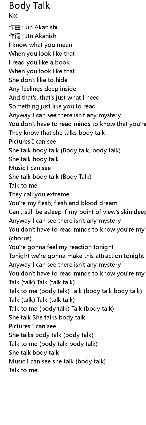 | Talk to me (body talk) Talk (body talk body talk) | |