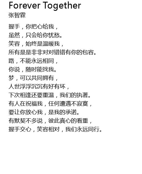 | wò shǒu jiāo xīn, xiào róng xiāng duì, wǒ men yǒng yuǎn tóng háng. |