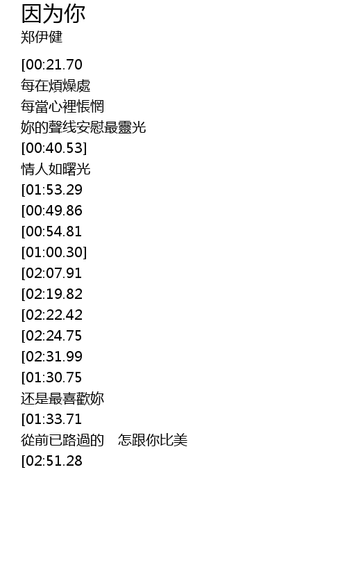| [03:03.51][02:07.91][01:01.80] | 因為妳 是我連綿不息的日記 |