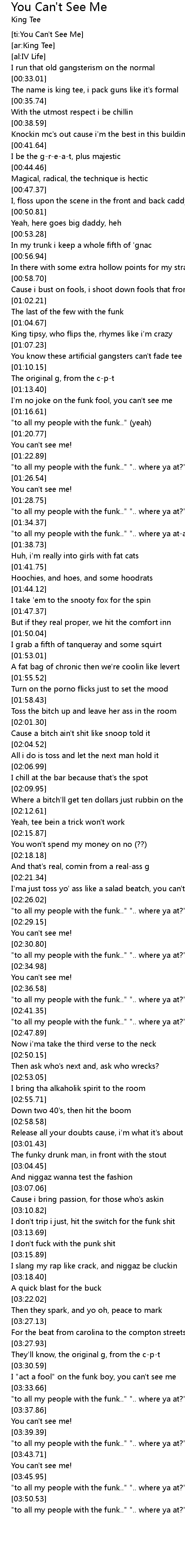 | [02:21.50] | I'ma just toss yo' ass like a salad beatch, you can't see me |