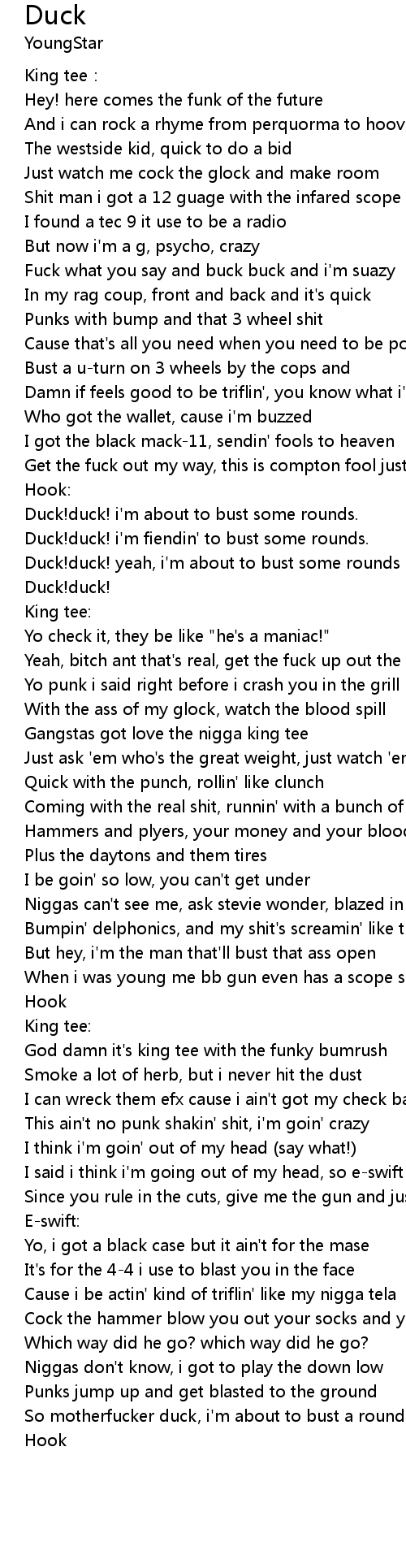 | Duck! duck! yeah, i' m about to bust some rounds | |
