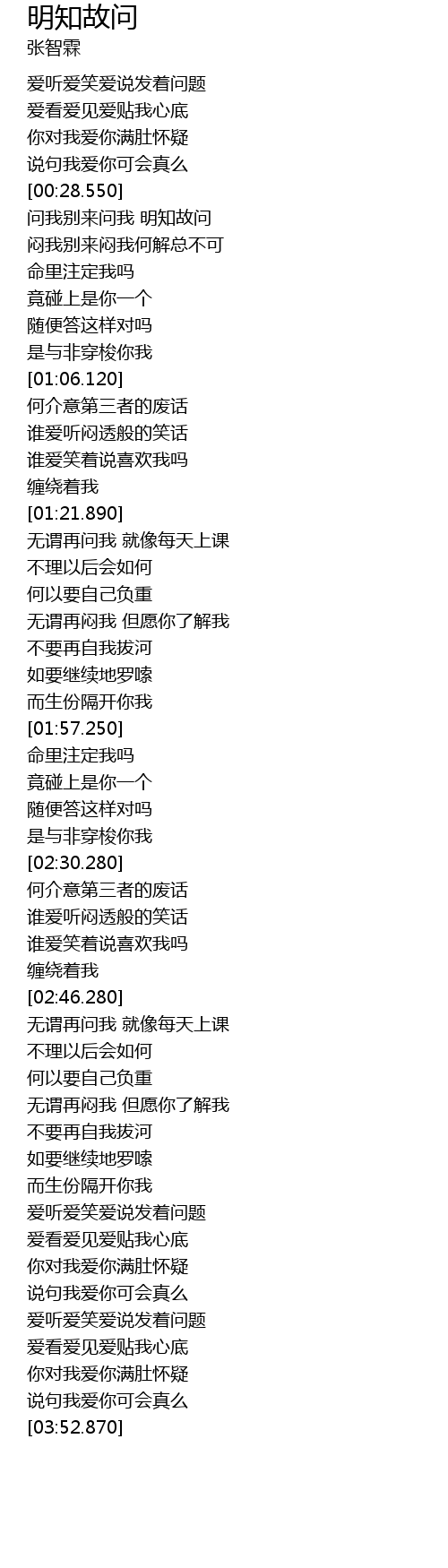 | [00:35.800] | wèn wǒ bié lái wèn wǒ míng zhī gù wèn |