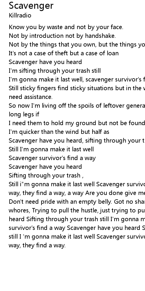 Still i"m gonna make it last well Scavenger survivors find a way They find a way, they find a way, a way Are you done give me some, Cause I'm fuckin hungry Don't need pride with an empty belly. Got no shame cause I know we're all whores, Trying to pull the hustle, just trying to pull the Scavenger. have you heard Sifting through your trash still I'm gonna make it last well Scavenger survivor's find a way Scavenger have you heard Sifting through your trash , still I 'm gonna make it last well Scavenger survivors find a way They find a way, they find a way. |