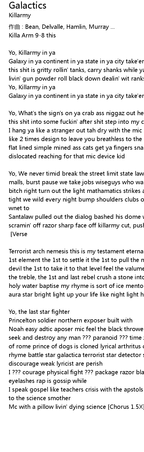 | Galaxy in ya continent in ya state in ya city take'em to war throw ya grenade this shit is gritty rollin' tanks, carry shanks while ya'll niggaz shoot blanks livin' gun powder roll black down dealin' wit ranks | |