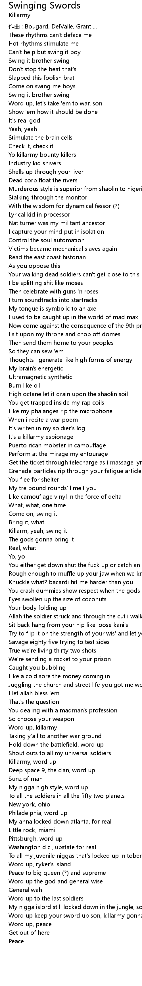| Word up keep your sword up son, killarmy gonna represent this shit, son | |