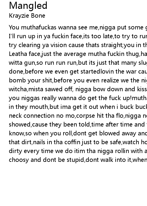 Leatha face,just the average mutha fuckin thug,had to spit if for fun bad nigga witta gun,so run run run,but its just that many slugs comin and you'll be done done,before we even get startedlovin the war cause its the art of it,and we'll bomb your shit,before you even realize we the niggas with the problem witcha,mista sawed off, nigga bow down and kiss this, click click, wassup!what you niggas really wanna do get the fuck up!muthafuckas shoulda neva put my name in they mouth,but ima get it out when i buck buck,and you explode!ya head ya neck connection no mo,corpse hit tha flo,nigga never realize until they been showed,cause they been told,time after time and they still actin like they dont know,so when you roll,dont get blowed away and stowed away,in a box up under that dirt,nails in tha coffin just to be safe,watch how we play,down with the dirty every time we do itim tha nigga rollin with a gold tec and ill use itso be choosy and dont be stupid,dont walk into it,when you see the |