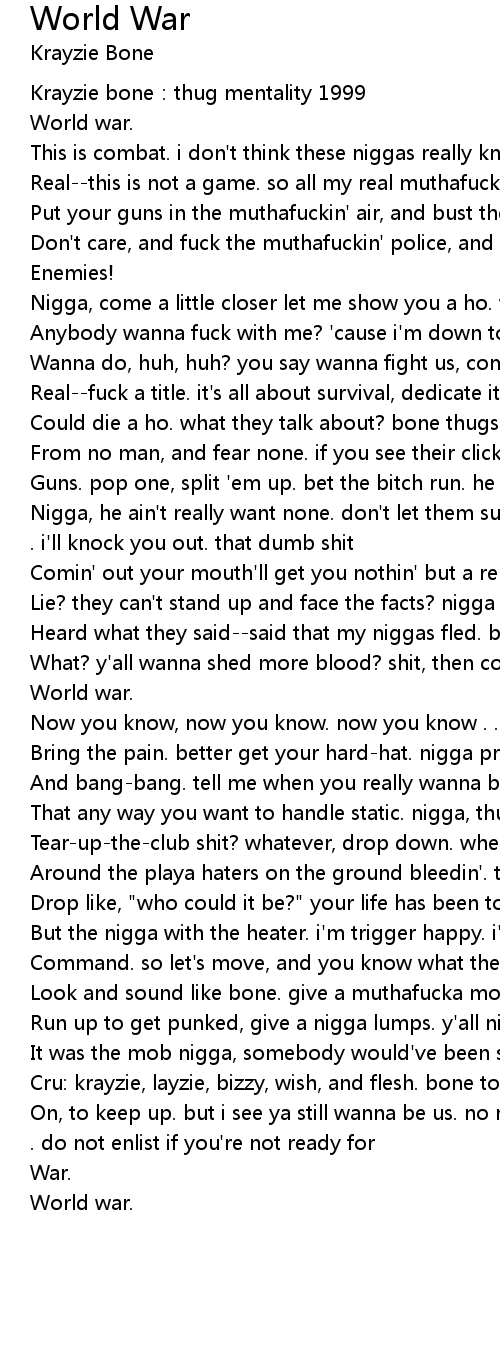 | Bring the pain. better get your hard-hat. nigga protect your brain. get a gun | |