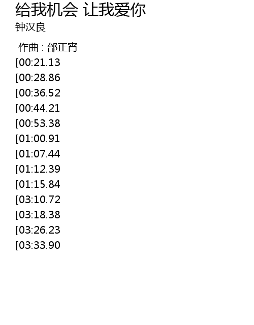 | [04:12.65][03:26.23][01:39.53] | 给我机会 让我爱你 |