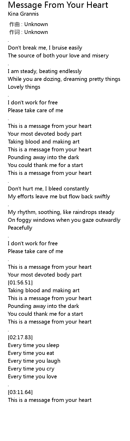 | [01:51.77] | This is a message from your heart |