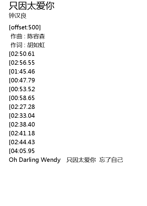 | [03:01.54][01:45.46][00:35.22] | Oh Darling Wendy 只因太爱你 忘了自己 |