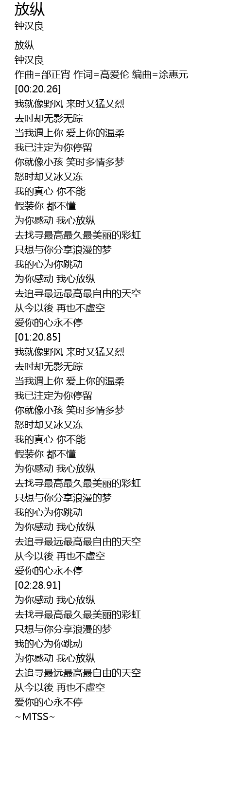 | [00:16.72] | 作曲=邰正宵 作词=高爱伦 编曲=涂惠元 |