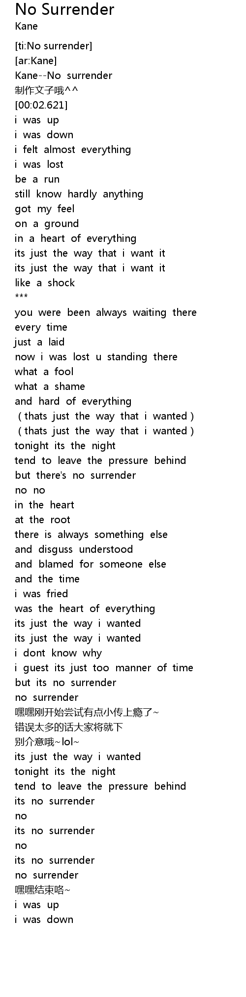 | [00:00.538] | Kane--No surrender |