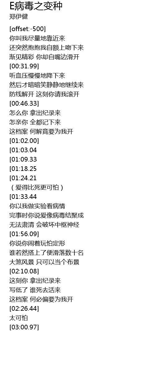 | [01:47.40] | 完事时你说爱像病毒结聚成 |