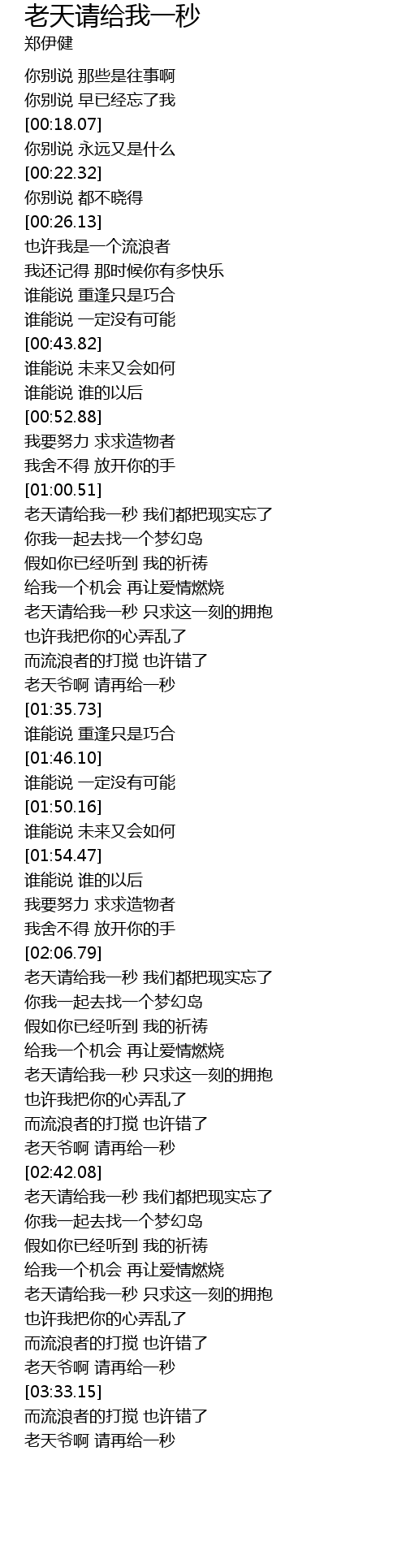 | [03:16.72] | 老天请给我一秒 只求这一刻的拥抱 |