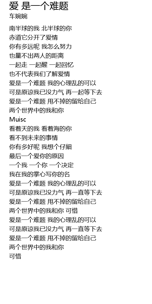 | [03:04.49] | 爱是一个难题 我的心理乱的可以 |