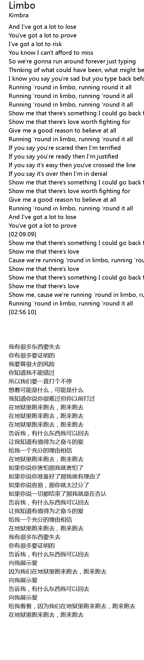| [02:45.18] | Show me, cause we're running 'round in limbo, running 'round it all |