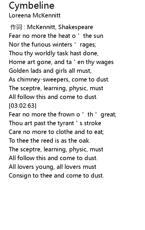 | [01:50.25] | Fear no more the heat o' the sun |