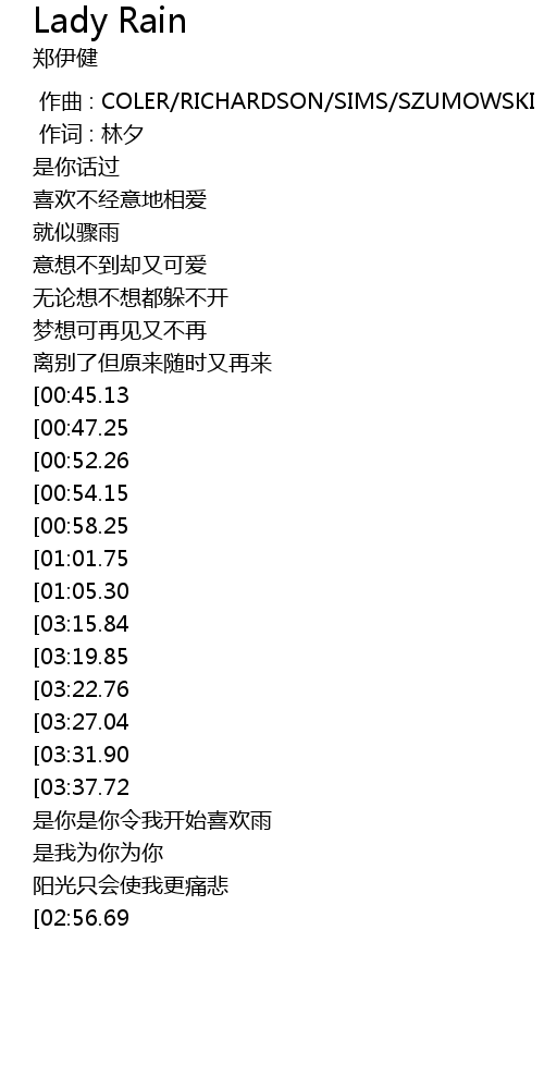 | [03:41.09][03:15.84][02:12.02][01:11.92] | Lady Rain |