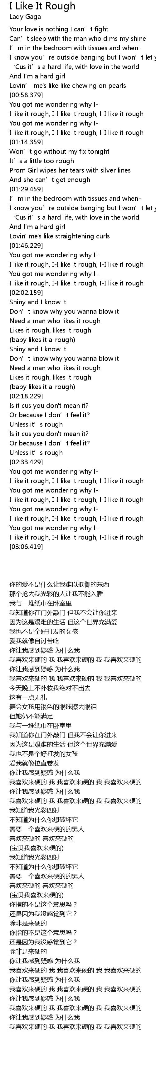 | [03:00.439] | I like it rough, I-I like it rough, I-I like it rough |