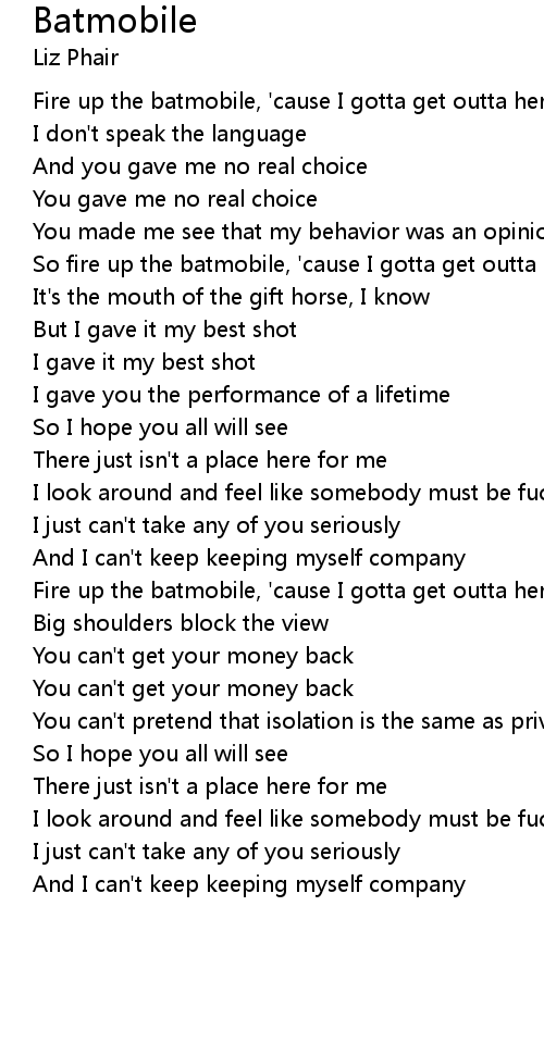 | Fire up the batmobile, 'cause I gotta get outta here | |