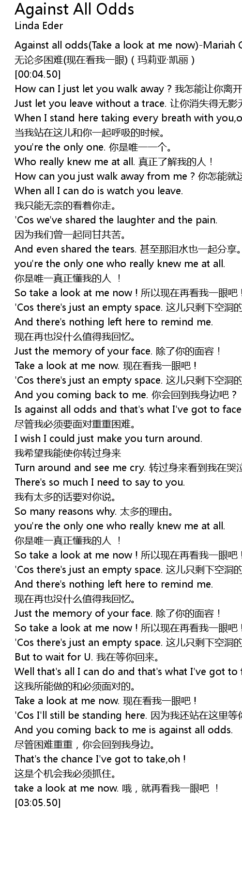 | [00:01.50] | Against all odds Take a look at me now Mariah Carrey wú lùn duō kùn nán xiàn zài kàn wǒ yī yǎn mǎ lì yà kǎi lì |