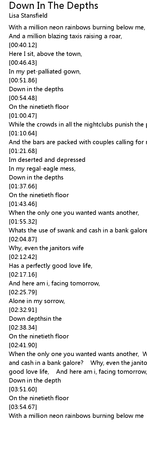 When the only one you wanted wants another, Whats the use of swank and cash in a bank galore? Why, even the janitors wife Has a perfectly good love life, And here am i, facing tomorrow, Alone in my sorrow, Down in the depth |
