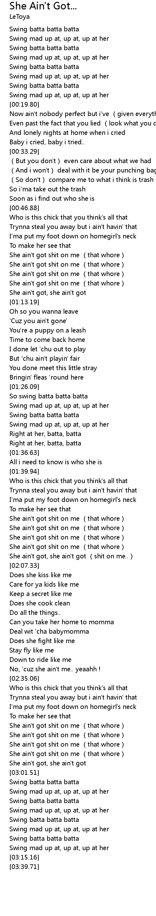 | [02:59.74] | She ain't got, she ain't got |