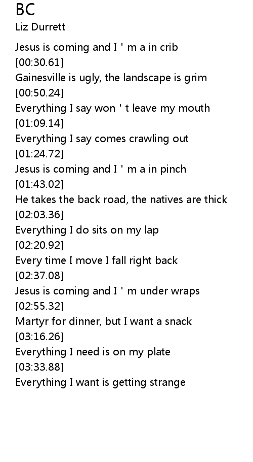 | [00:18.83] | Jesus is coming and I m a in crib |
