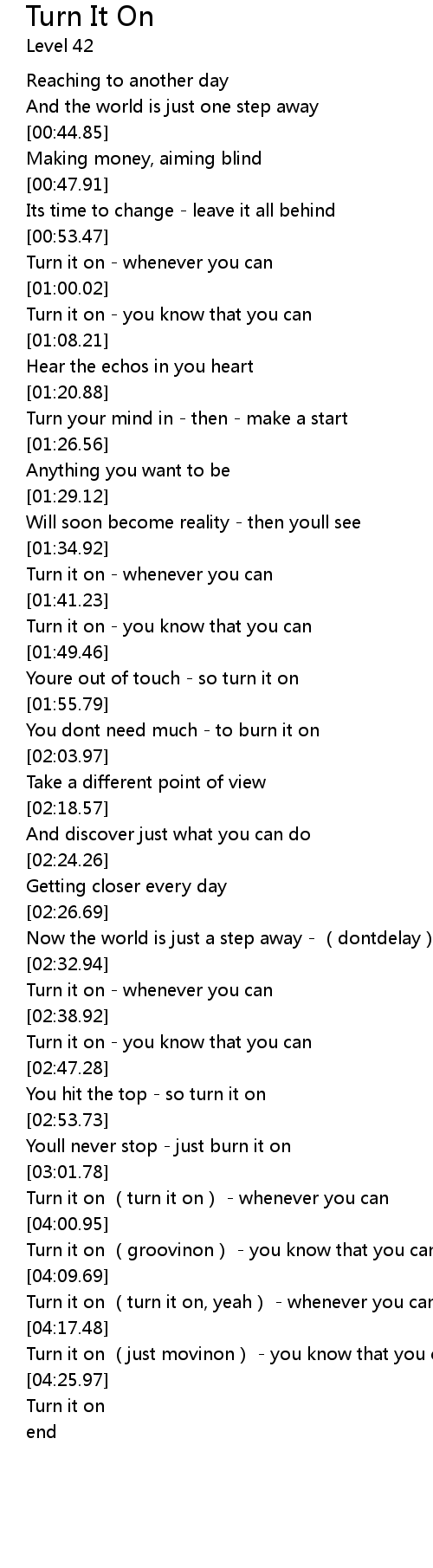 | [04:12.18] | Turn it on (turn it on, yeah) - whenever you can |