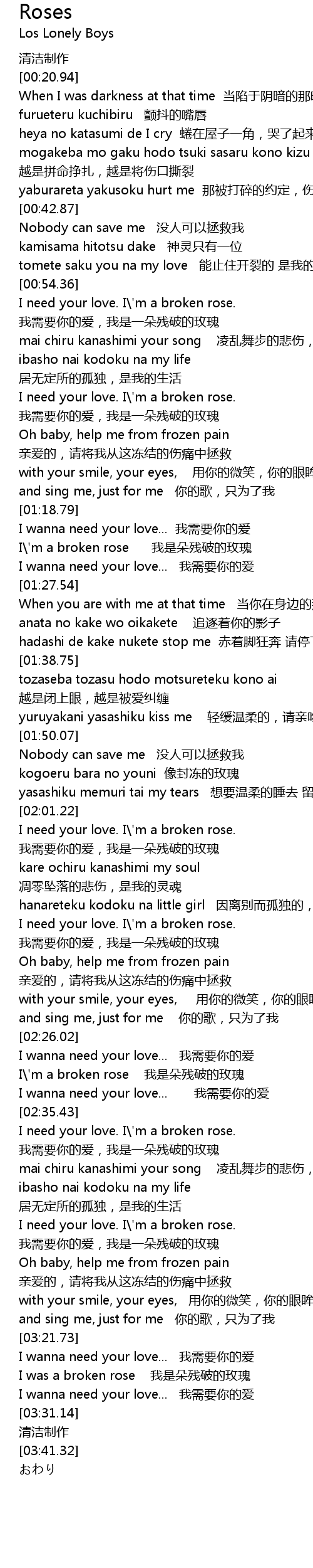| [02:02.11] | I need your love. I\'m a broken rose. 我需要你的爱,我是一朵残破的玫瑰 |