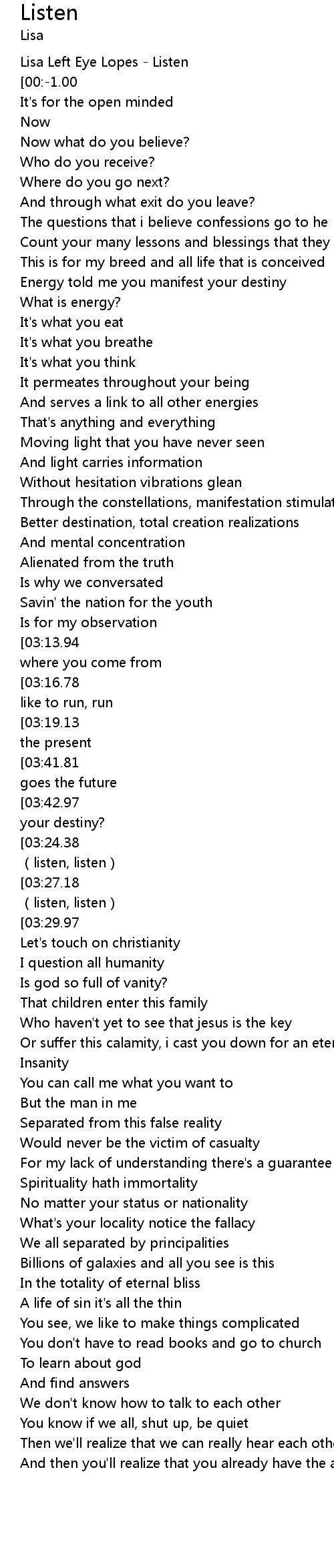 | [00:-4.00] | Lisa Left Eye Lopes Listen |