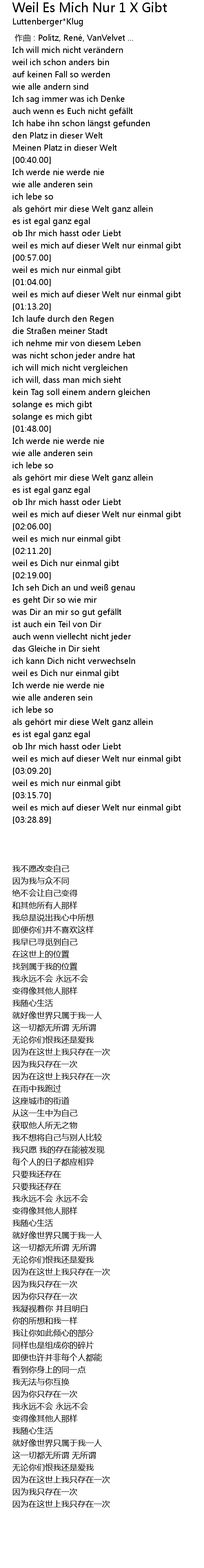 | [03:20.20] | weil es mich auf dieser Welt nur einmal gibt |