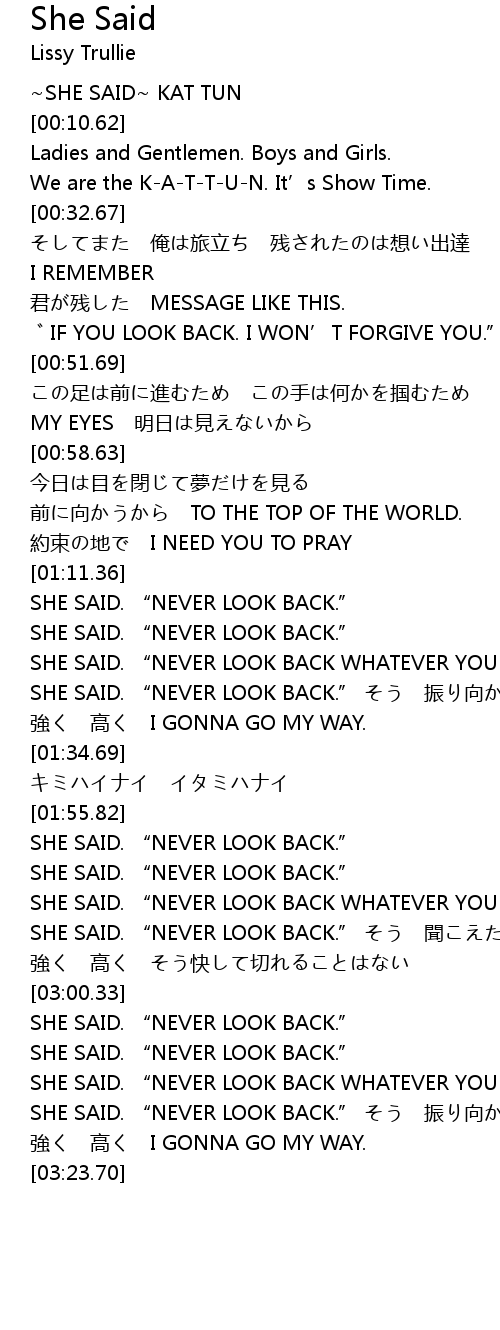 | [00:02.68] | ~SHE SAID~ KAT TUN |